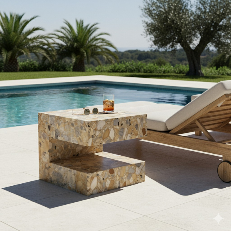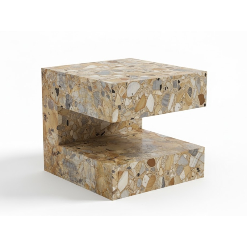 Uma peça multifuncional de design assinado que impressiona pela sua forma e matéria. Este banco baixo (ou mesa lateral) é esculpido em um bloco único de rocha, com um design geométrico em “C”. Sua forma robusta e minimalista serve tanto como um assento funcional quanto como uma mesa de apoio escultural.